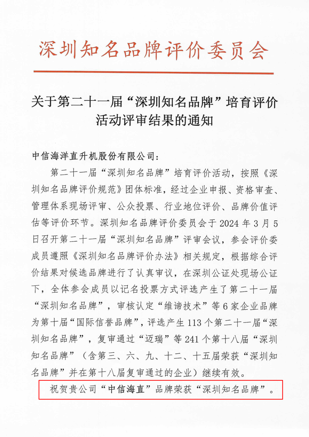近日,深圳知名品牌评价委员会公布第二十一届“深圳知名品牌”评审结果。中信海直凭借高品质品牌影响力和高知名度社会声誉从428家申报企业中脱颖而出,荣获第二十一届“深圳知名品牌”称号。