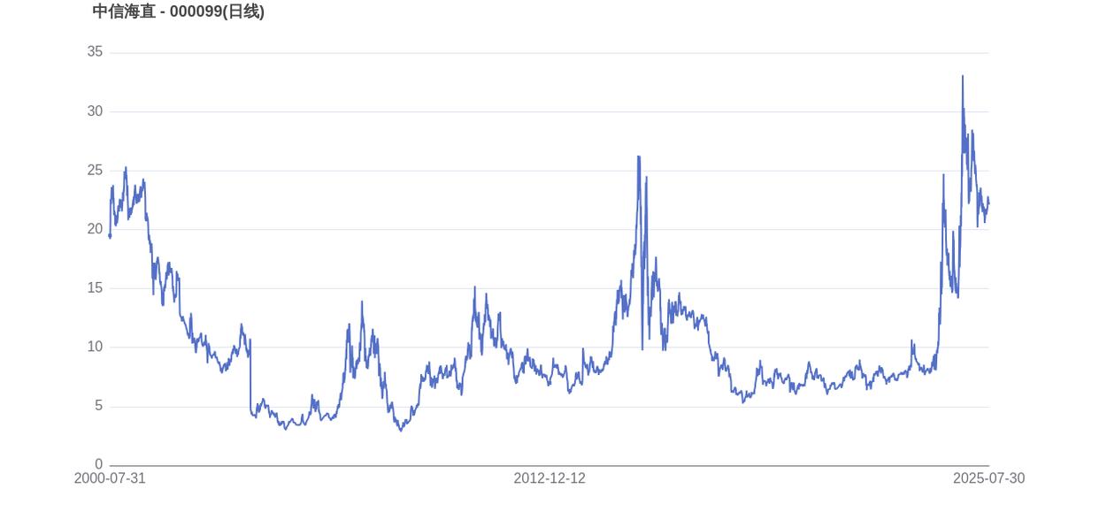 中信海直自2000年07月31日上市至今,已迎来25周年。从上市首日收盘价为19.5元、市值38.22亿元,到如今市值达到171.76亿元。