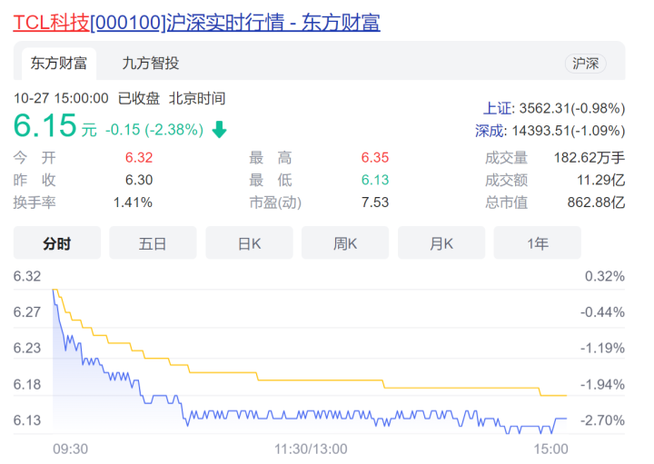 东方财富网显示,10月27日开盘后,TCL科技股价一路下跌,收报6.15元/股,下跌2.23%,距离上半年10.12元的高点已缩水近四成。