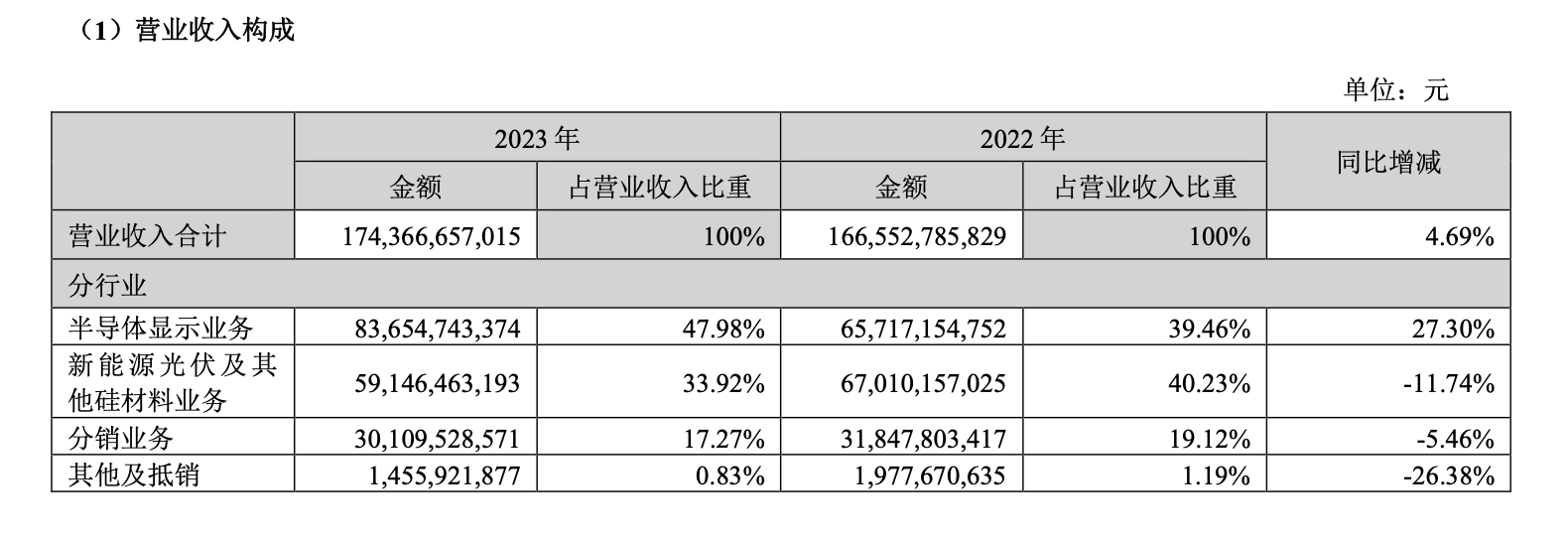 报告期内,TCL科技另一核心主业新能源光伏业务实现营业收入591.46亿元,净利润38.99亿元。其中,光伏材料业务出货量同比增长68%至114GW,硅片整体市占率23.4%,实现营业收入437.91亿元,综合毛利率同比提升2.8个百分点至21.8%;光伏组件业务出货量8.6GW,同比增长29.8%,实现营业收入93.09亿元。