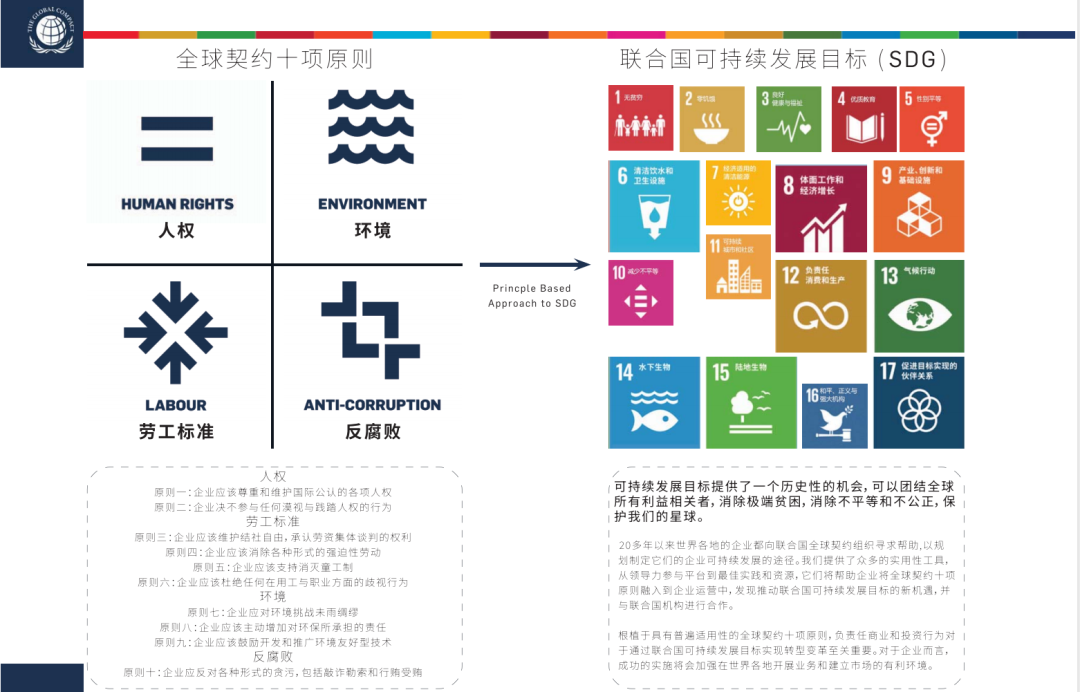 联合国全球契约是全球最大的企业可持续发展倡议,自2000年成立至今已在全球160多个国家拥有超过23000家参与企业及利益相关方。联合国全球契约组织的目标是通过坚持十项原则,并通过负责任的公司和促进变革的生态系统实现可持续发展目标(SDG),加速和扩大企业的全球集体影响力。