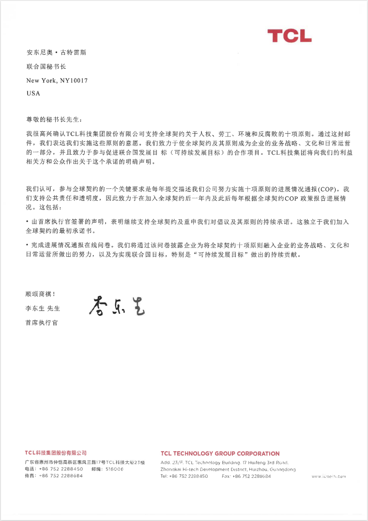 TCL创始人、董事长李东生关于TCL科技集团加入UNGC的承诺书