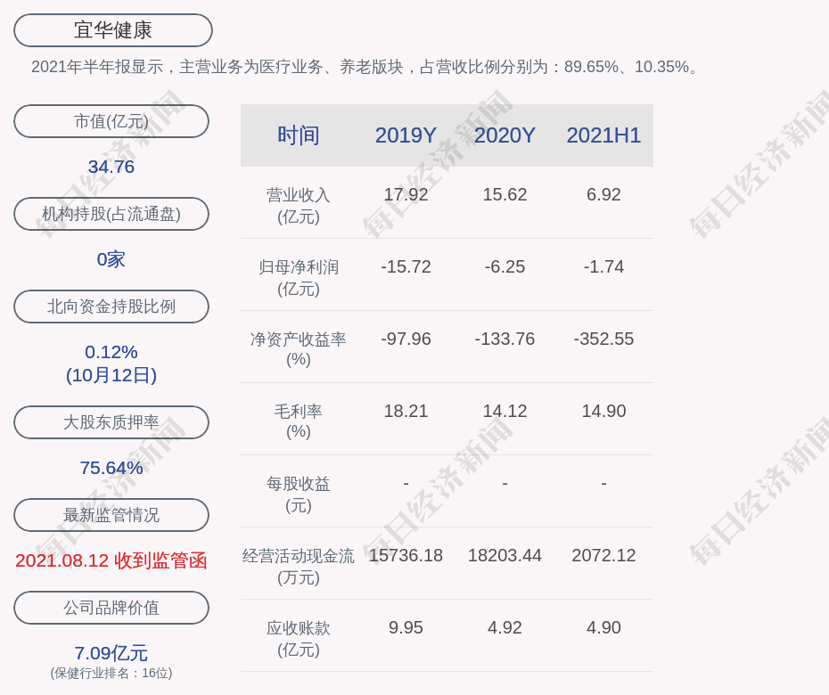 2021年半年报显示,宜华健康的主营业务为医疗业务、养老版块,占营收比例分别为:89.65%、10.35%。