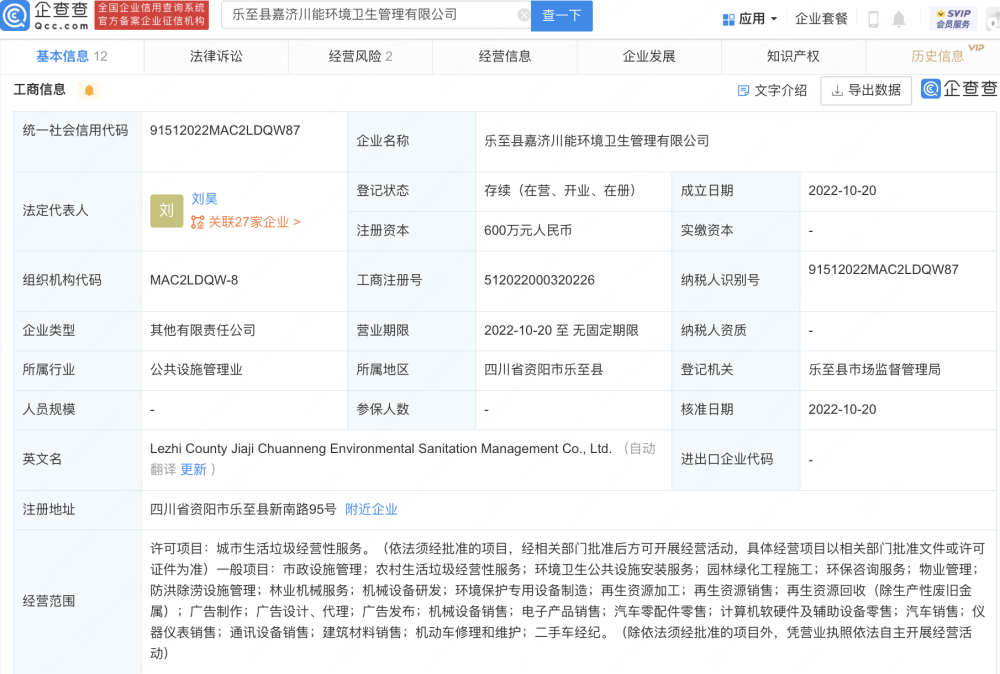APP显示,近日,乐至县嘉济川能环境卫生管理有限公司成立,法定代表人为刘昊,注册资本600万元人民币,经营范围包含:汽车零配件零售;汽车销售;机动车修理和维护;二手车经纪等。股权穿透显示,该公司由川能动力(000155)等间接共同持股。
