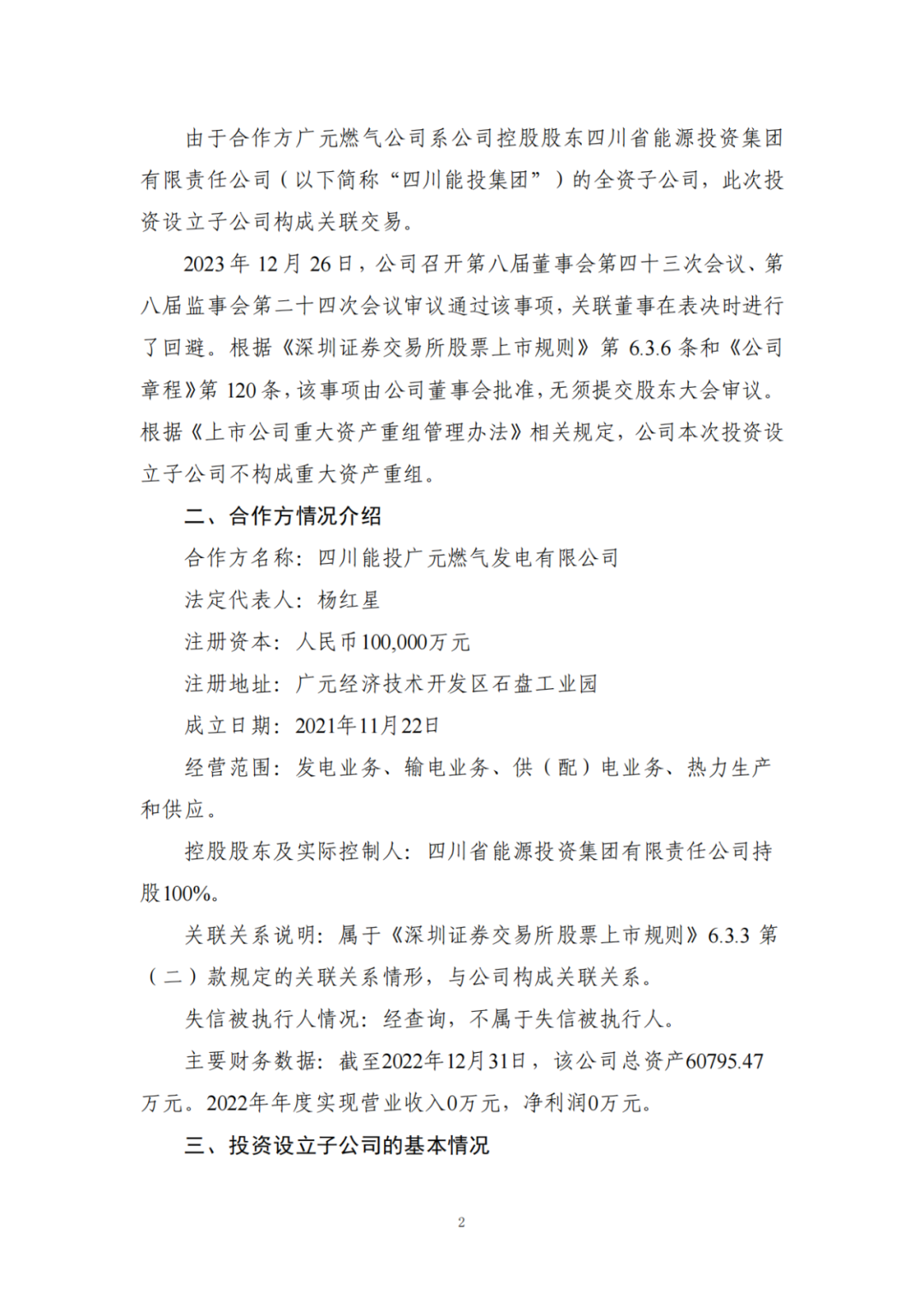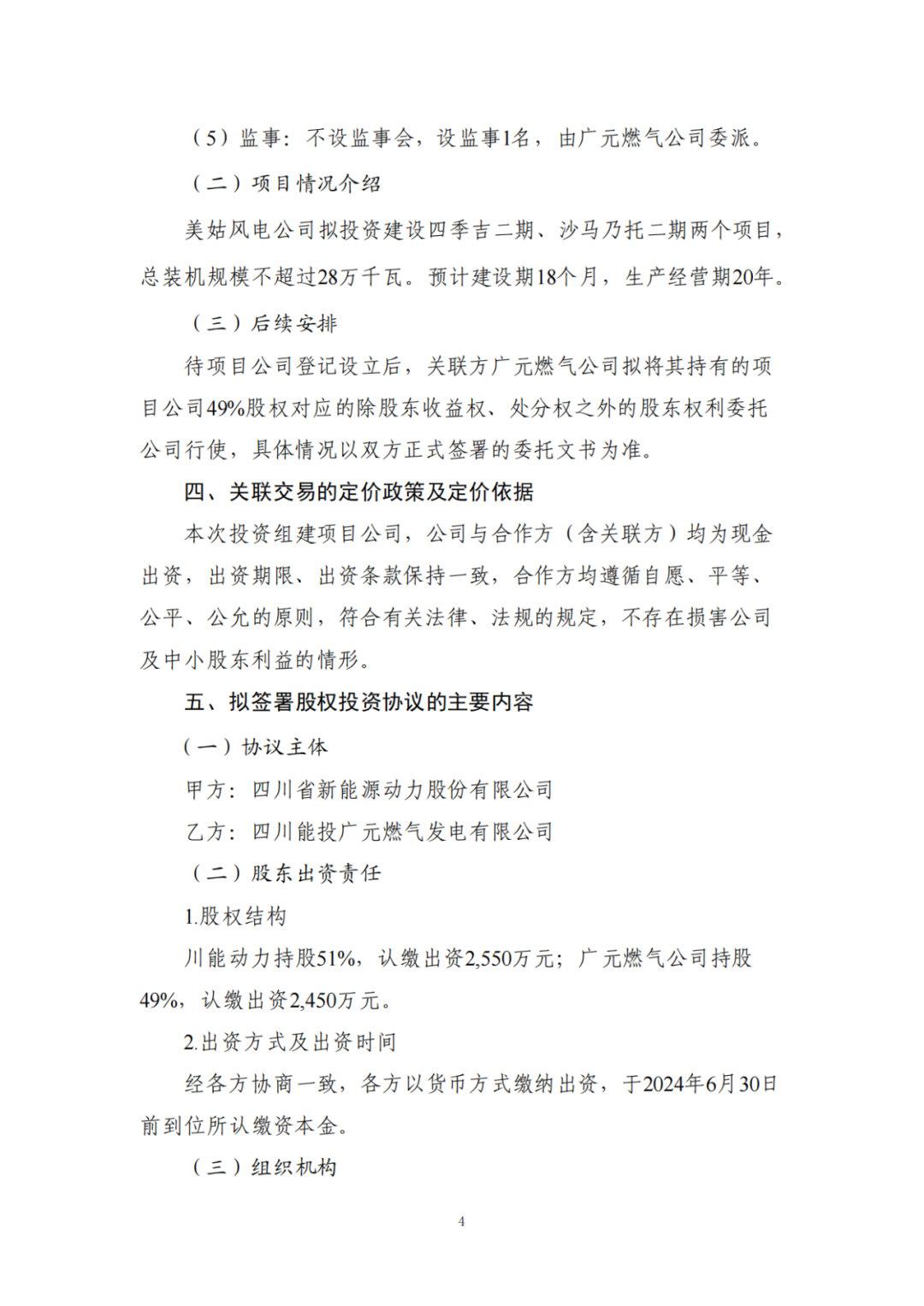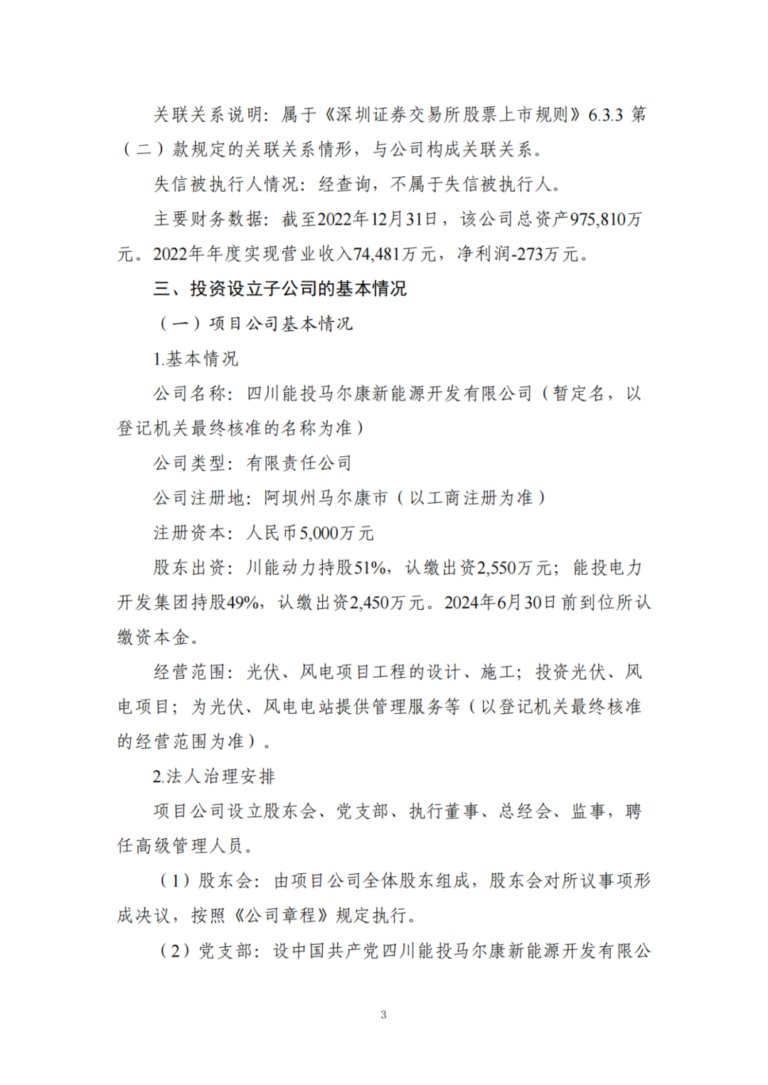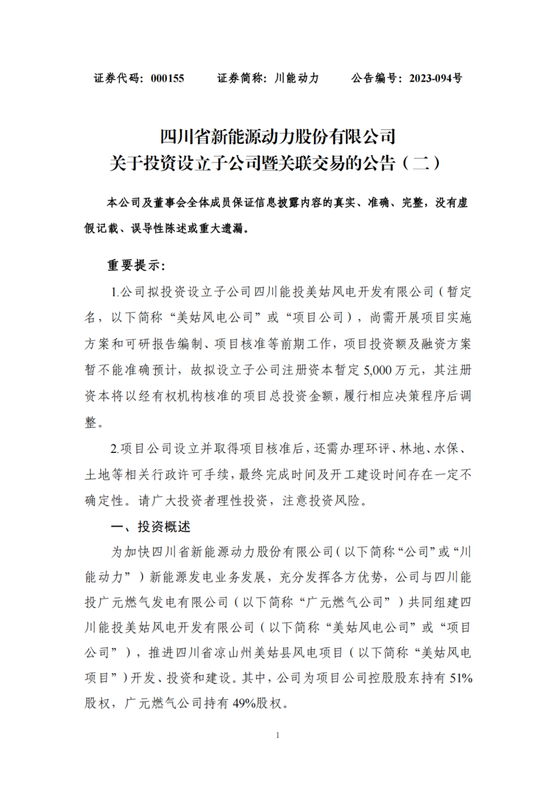 川能动力与四川能投广元燃气发电有限公司共同组建四川能投美姑风电开发有限公司(以下简称“美姑风电公司”或“项目公司”),推进四川省凉山州美姑县风电项目(以下简称“美姑风电项目”)开发、投资和建设。其中,川能动力为项目公司控股股东持有51%股权,广元燃气公司持有49%股权。