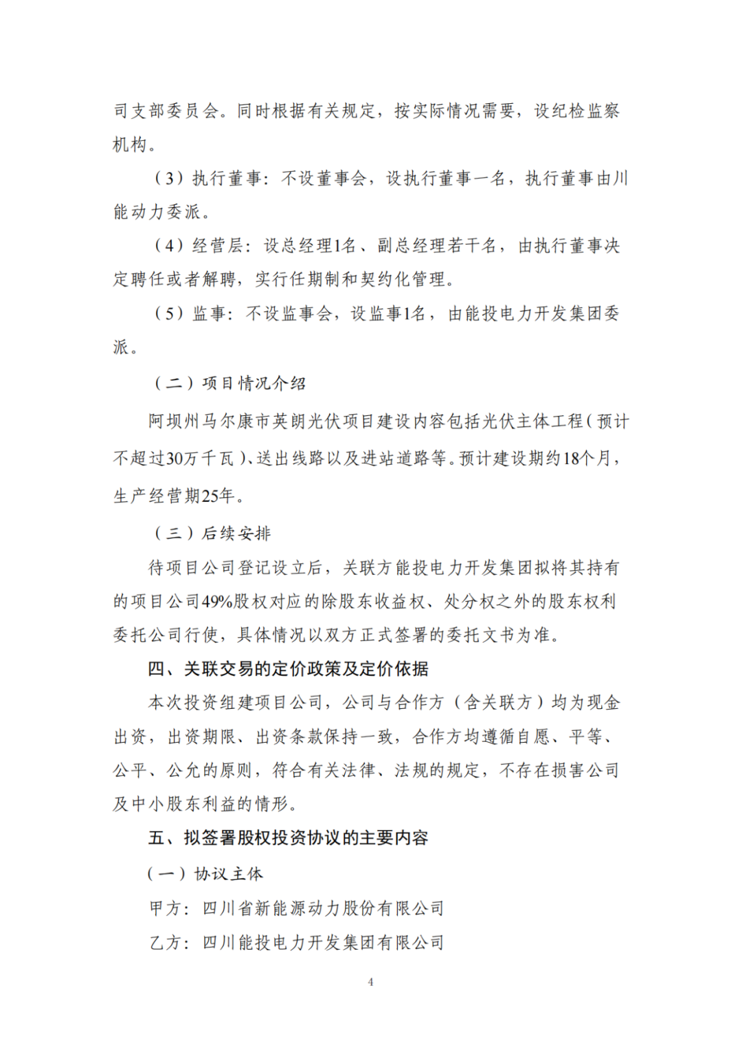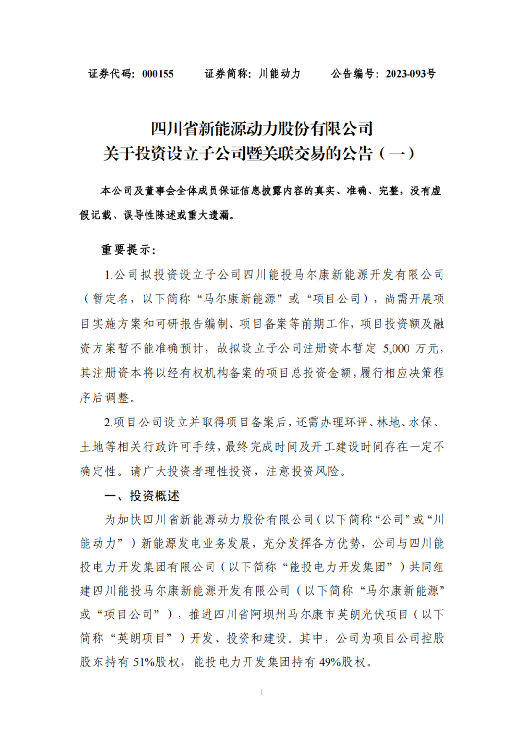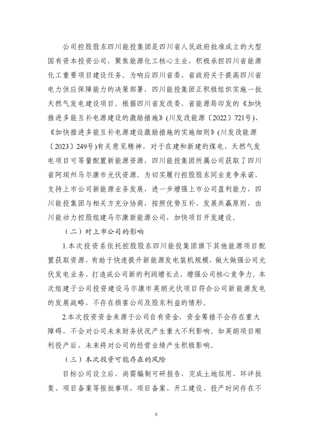 公告指出,为加快川能动力新能源发电业务发展,充分发挥各方优势,川能动力与四川能投电力开发集团有限公司共同组建四川能投马尔康新能源开发有限公司(以下简称“马尔康新能源”或“项目公司”),推进四川省阿坝州马尔康市英朗光伏项目(以下简称“英朗项目”)开发、投资和建设。其中,川能动力为项目公司控股股东持有51%股权,能投电力开发集团持有49%股权。