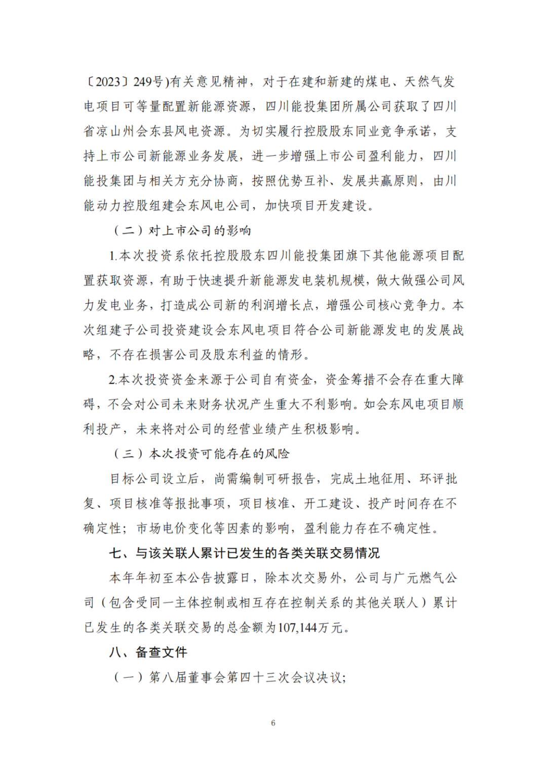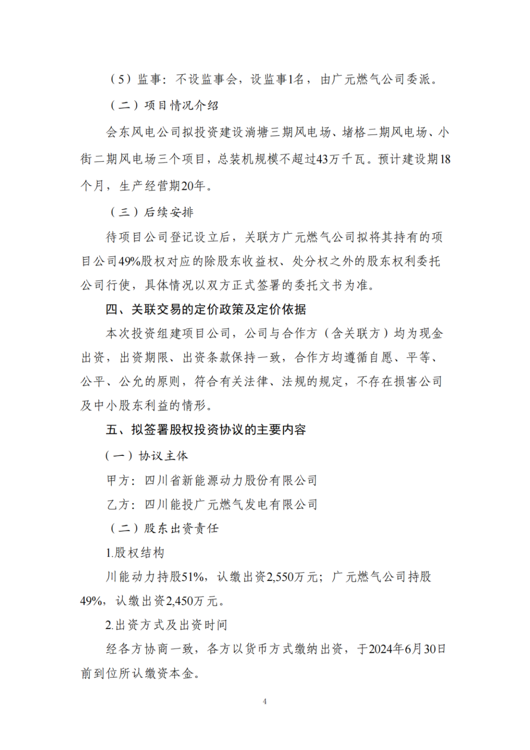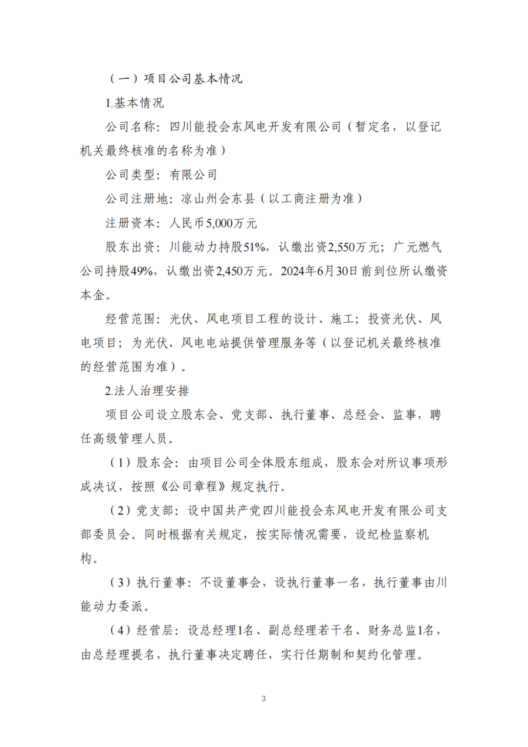 川能动力与四川能投广元燃气发电有限公司共同组建四川能投会东风电开发有限公司(以下简称“会东风电公司”或“项目公司”),推进四川省凉山州会东县风电项目(以下简称“会东风电项目”)开发、投资和建设。其中,川能动力为项目公司控股股东持有51%股权,广元燃气公司持有49%股权。