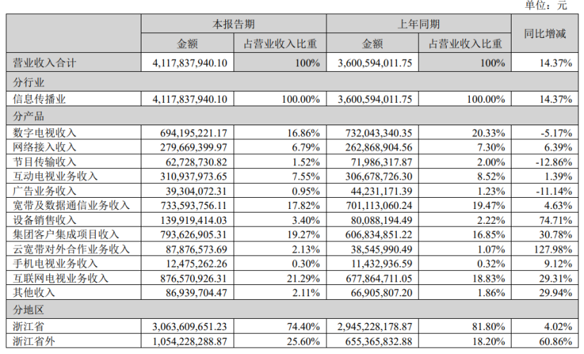 据介绍,华数传媒的主营业务为有线电视网络业务、全国范围内的新媒体业务、宽带网络及智慧城市业务等。据统计,其智慧城市业务收入与互动电视、互联网电视等全国新媒体业务收入合计占比已超过半数,有线电视网络相关业务收入占比不到一半。均衡的业务构成使得其公司在行业用户流失与严峻市场竞争的环境下,仍保持了经营业绩多年连续稳健增长。