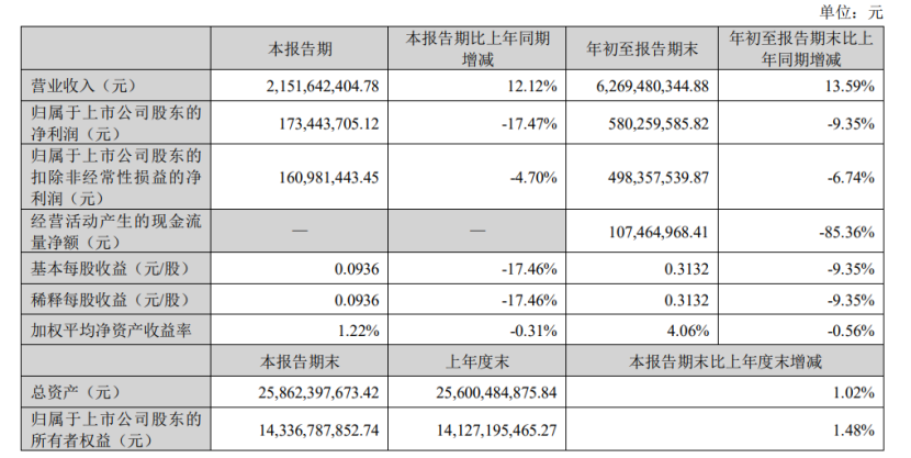 第三季度实现营业收入为21.52亿元,同比增长了12.12%;归属于上市公司股东的净利润为1.73亿元,同比减少了17.47%。至本期,其总资产为258.62亿元,归属于上市公司股东的所有者权益为143.37亿元。