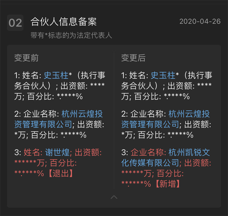 信息显示,2020年4月,云溪投资发生合伙人变更,谢世煌退出,增加了杭州凯锐文化传媒有限公司,后者由邓妙和王锐分别持股50%。