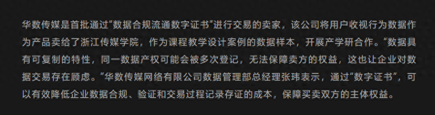 据悉,华数传媒是首批通过“数据合规流通数字证书”进行交易的卖家。公众号声称,“该公司将用户收视行为数据作为产品卖给了浙江传媒学院,作为课程教学设计案例的数据样本,开展产学研合作”。