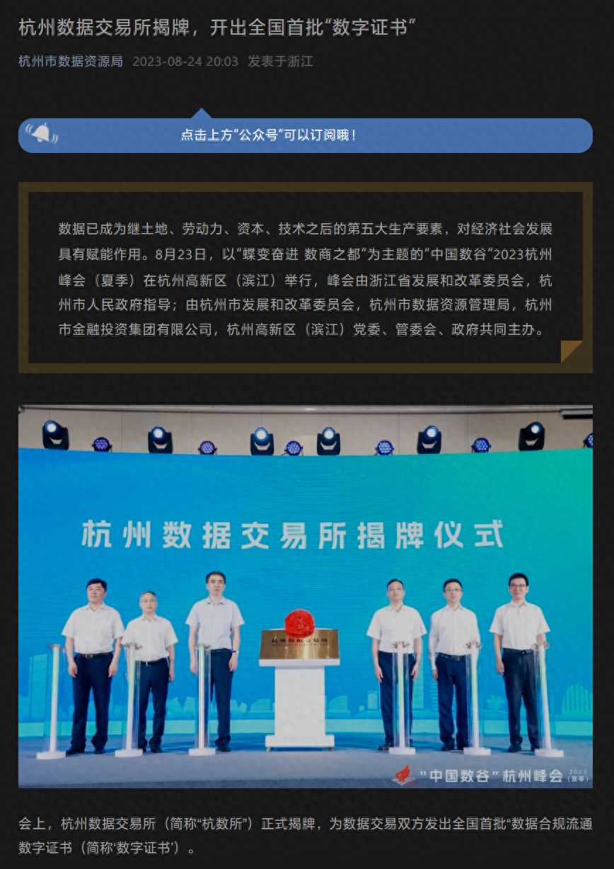 IT之家 8 月 25 日消息,据杭州市数据资源局官方公众号消息,“中国数谷”2023 杭州峰会(夏季)日前在杭州高新区(滨江)举行,会上杭州数据交易所(简称“杭数所”)正式揭牌,为数据交易双方发出全国首批“数据合规流通数字证书(简称‘数字证书’)”。