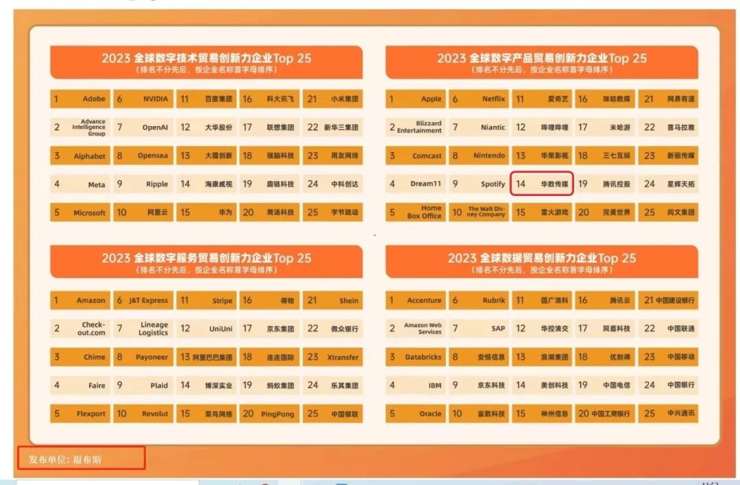 2023年华数传媒入选福布斯“2023全球数字产品贸易创新力企业TOP25”。