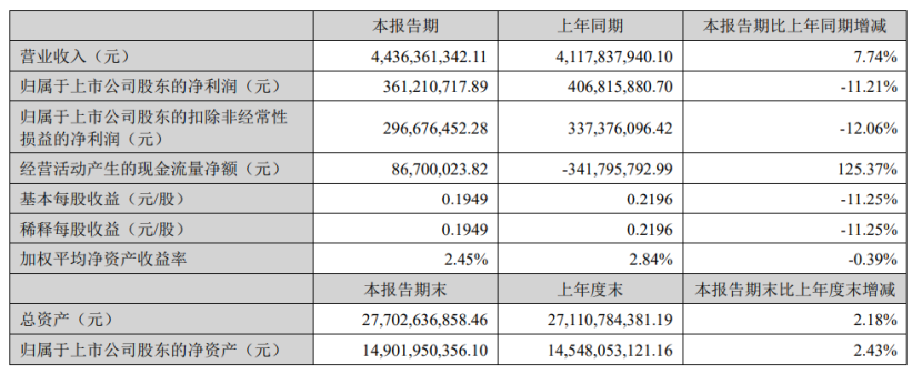 至2023年第三季度末,其总资产为46.98亿元,归属于上市公司股东的所有者权益为34.73亿元。在前三季度的业绩中,共实现营业收入为11.09亿元,同比增长了0.28%;归属于上市公司股东的净利润为4.99亿元,同比减少了2.60%。
