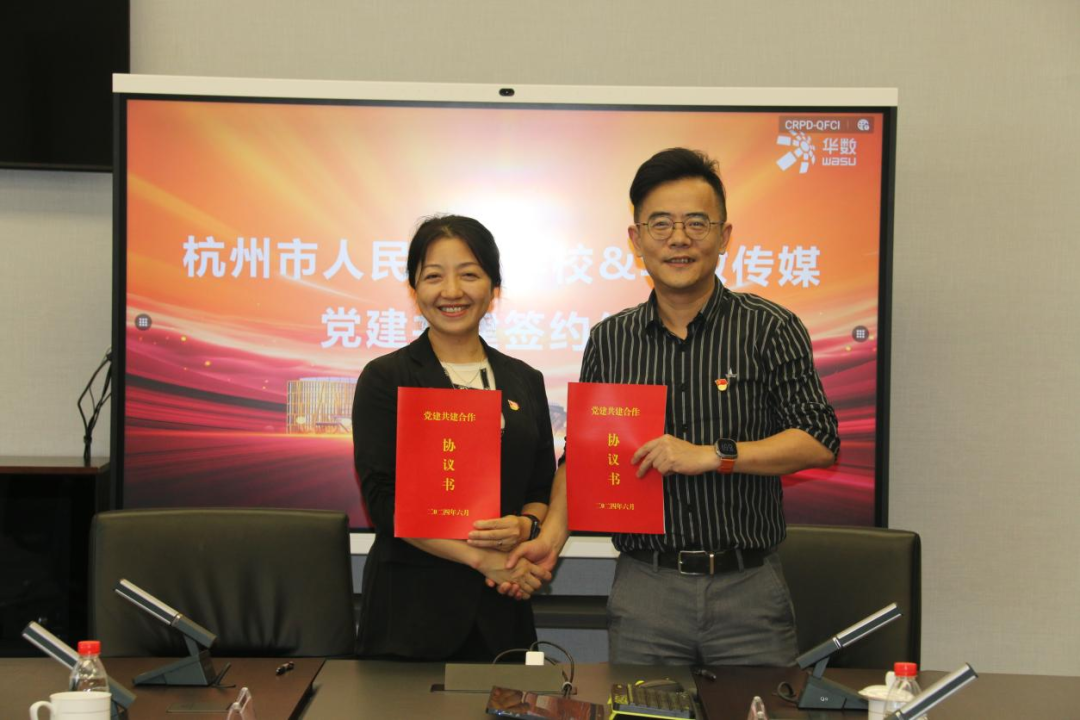 6月20日,华数传媒党委与杭州市人民警察学校党委举行党建共建签约仪式,杭州市人民警察学校党委书记张洁与华数传媒党委委员、副总裁许锐代表双方签署了合作协议书。