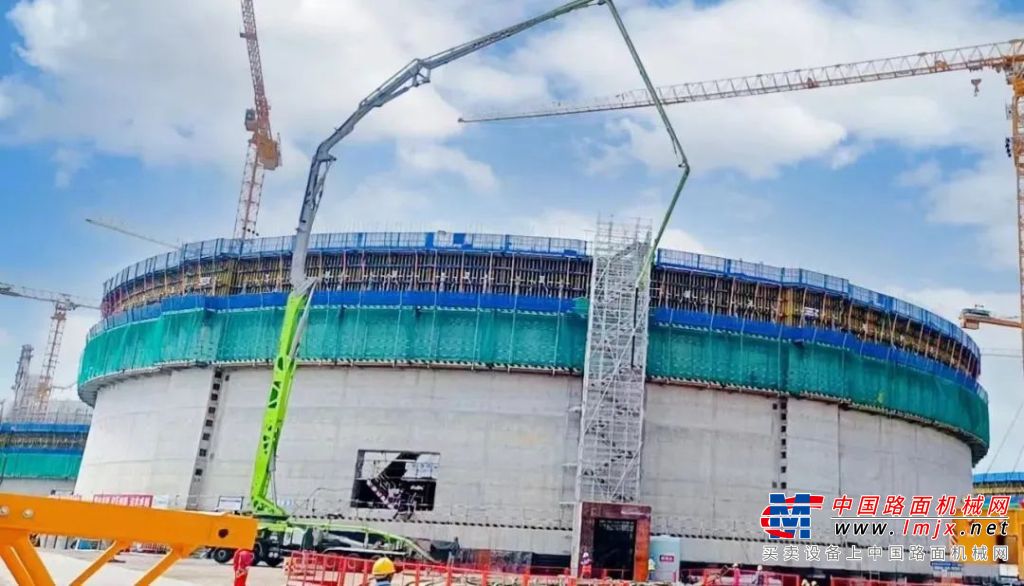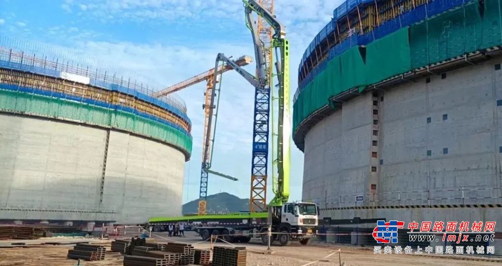 因此,与传统中小型LNG储罐相比,容量和尺寸增加的同时,施工难度也成倍增加。为保证高质量完成浇筑任务,针对墙体尺寸不规则、高差大、浇筑面广等施工难点,项目方最终选择两台中联重科“凌云Ⅱ”70米泵车承担重任,性能强悍。