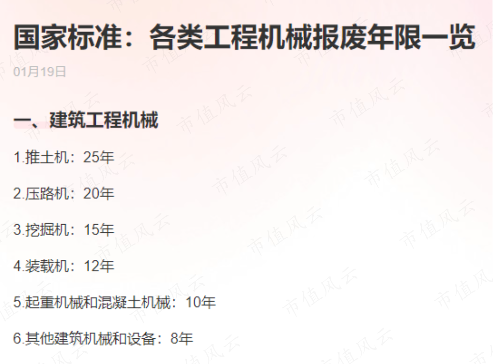 另一方面则来自存量机械设备的更新需求,常见工程机械的报废年限为8-15年,以此来看上一轮行业上行周期内新增设备的替代行情,在2023年还稍早了些。