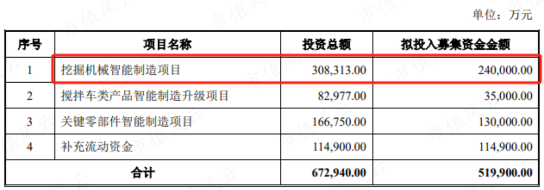 2021年,中联重科通过定增募集52亿资金,主要投资方向便是挖掘机械智能制造项目。该项目具备3.3万台挖掘机的年产能,总投资额超过30亿元。