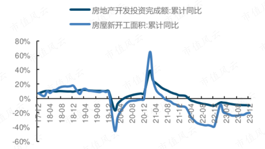 2023年国内房地产开发投资完成额、房屋新开工面积分别为11.09万亿、9.54亿平米,分别同比下滑16.6%、20.9%,且自月度数据看在2023年末仍在为同比下滑状态,并无起色。