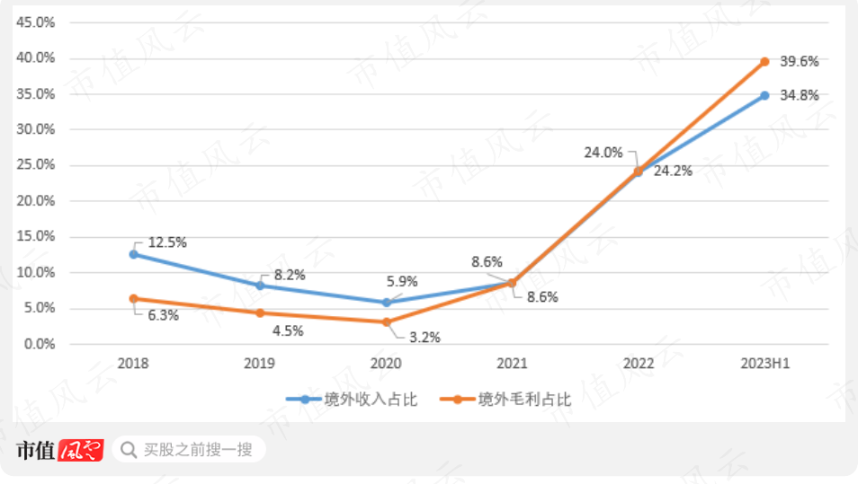 近两年来出口对于整体业绩的贡献比例也在显著提升。2023年上半年,来自境外销售的收入占比和毛利润占比分别为34.8%和39.6%。