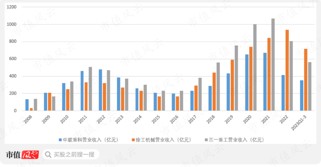徐工机械和三一重工的营收走势大致相同,但规模均高于中联重科,2022年分别为938.17亿和808.22亿。