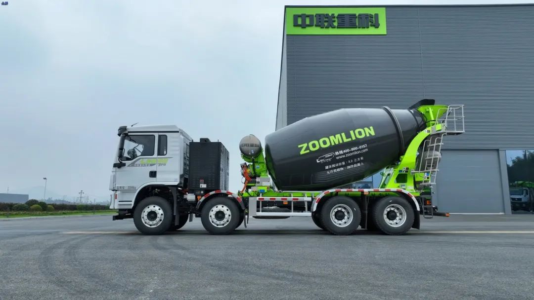 ▲中联重科“凌冠”32吨级纯电动混凝土搅拌运输车