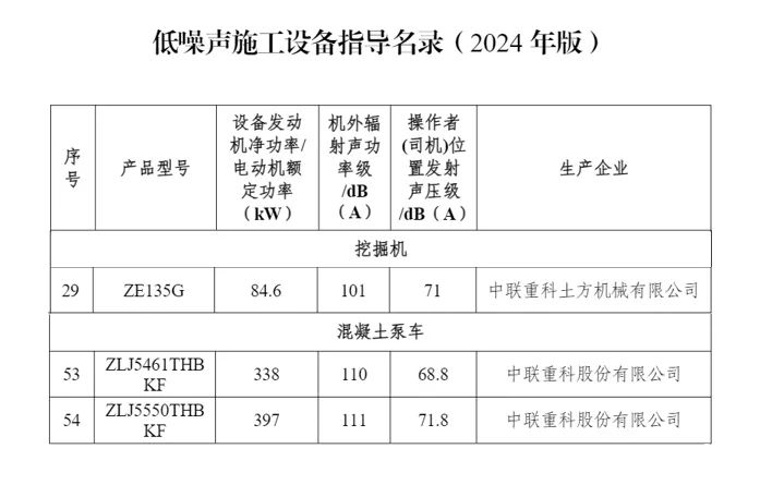 近日,工业和信息化部、生态环境部、住房和城乡建设部、国家市场监督管理总局等四部门联合发布了《低噪声施工设备指导名录(2024年版)》,中联重科一款挖掘机及两款混凝土泵车入选,在产品绿色低噪、节能环保方面再获权威认可。