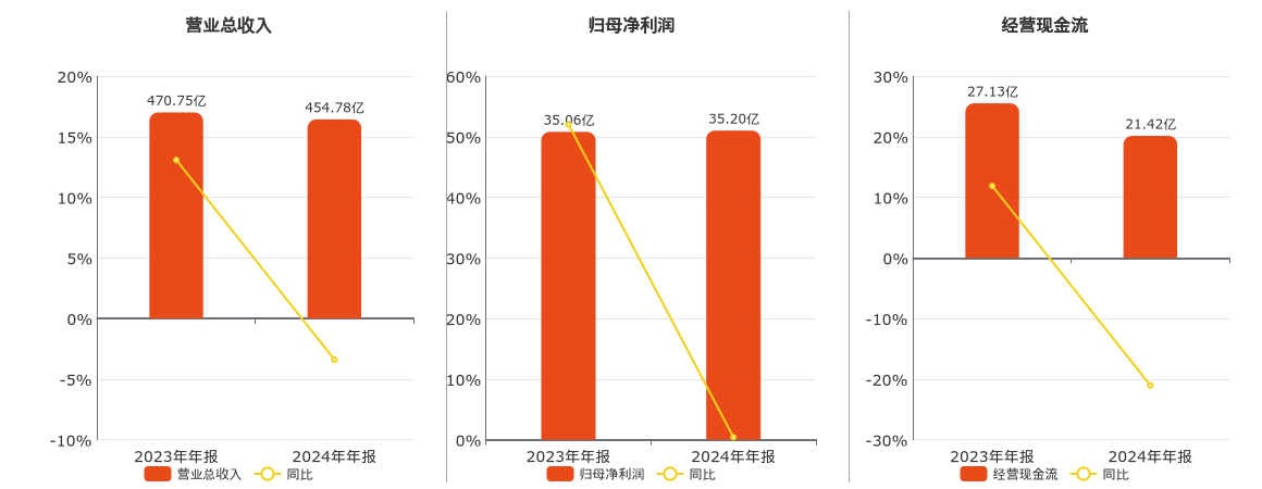 公司营业总收入为454.78亿元。归母净利润为35.20亿元,较去年同报告期归母净利润增加1436.59万元,实现2年连续上涨,同比较去年同期上涨0.41%。经营活动现金净流入为21.42亿元。