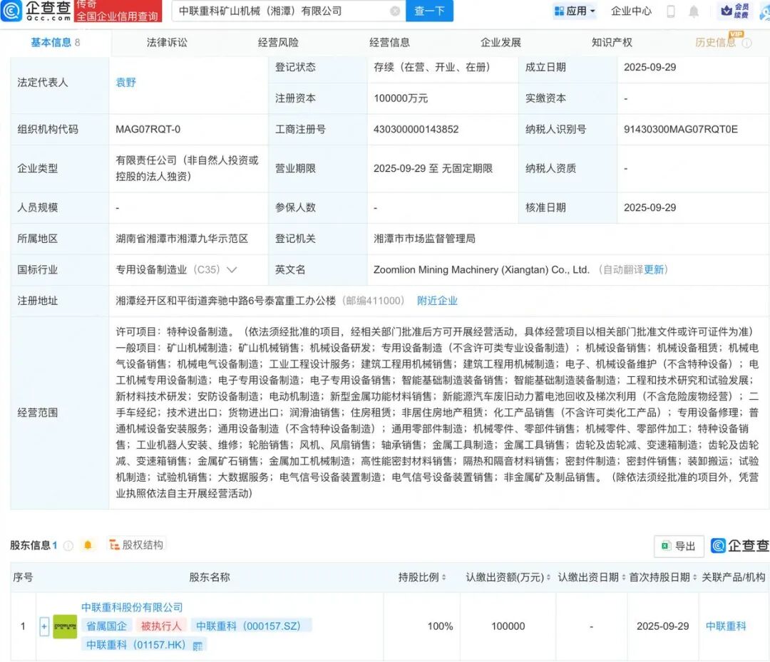 近日,中联重科矿山机械(湘潭)有限公司成立,注册资本10亿元,经营范围包含:智能基础制造装备制造;电子专用设备制造;二手车经纪;工业机器人安装、维修等。股权穿透显示,该公司由中联重科(000157)全资持股。
