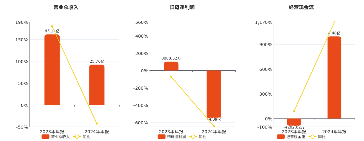 公司营业总收入为25.76亿元,较去年同报告期营业总收入减少19.38亿元,同比较去年同期下降42.93%。归母净利润为-4.39亿元,较去年同报告期归母净利润减少5.20亿元,同比较去年同期下降643.01%。经营活动现金净流入为4.48亿元。