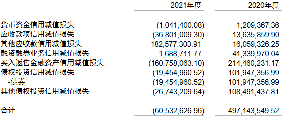 截至2021年12月31日,中国银河信用减值损失为-6053.26万元,上年同期为4.97亿元。中国银河表示,信用减值损失较2020年大幅减少,主要由于股票质押业务还款转回信用减值损失。