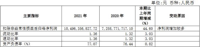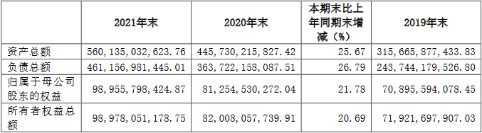 截至2021年末,中国银河的资产总额为5601.35亿元,同比增长25.67%;负债总额4611.57亿元,同比增长26.79%;资产负债率为77.07%,比上年同期增长0.82%;流动比率1.36,比上年同期增长3.03%;速动比率1.36,比上年同期增长3.03%。