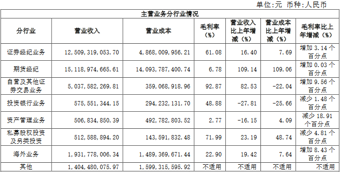 主营业务分行业来看,2021年,中国银河证券经纪业务实现营业收入125.09亿元,同比增长16.40%,毛利率为61.08%,较上年同期增加3.14个百分点;期货经纪实现营业收入151.19亿元,同比增长109.14%,毛利率为6.78%,较上年同期增加0.03个百分点;自营及其他证券交易业务实现营业收入50.38亿元,同比增长82.53%,毛利率为92.87%,较上年同期增加9.56个百分点;投资银行业务实现营业收入5.76亿元,同比下降27.81%,毛利率为48.88%,较上年同期减少1.48个百分点;资产管理业务实现营业收入5.07亿元,同比下降16.15%,毛利率为2.77%,较上年同期减少18.19个百分点;私募股权投资及另类投资实现营业收入5.13亿元,同比增长23.19%,毛利率为71.99%,较上年同期减少4.81个百分点;海外业务实现营业收入19.32亿元,同比增长19.42%,毛利率为22.90%,较上年同期增加8.43个百分点;其他业务实现营业收入14.04亿元。