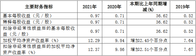 2021年,中国银河基本每股收益为0.97元/股,同比增长36.62%;加权平均净资产收益率为12.29%,较上年同期增加2.45个百分点。