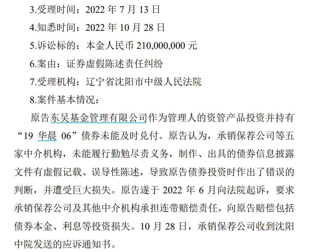 11月2日,申万宏源发布了关于子公司申万宏源证券承销保荐有限责任公司(下称“申万宏源承销保荐公司”)的涉诉公告。公告显示,原告为东吴基金管理有限公司(下称“东吴基金”),其作为管理人的资管产品投资并持有“19华晨06”债券未能及时兑付。