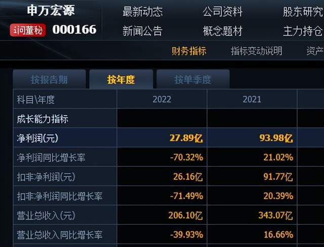 2022年,申万宏源实现营业收入206.10亿元,同比下降39.93%;归属于母公司所有者的净利润27.89亿元,同比下降70.32%。不难看出,申万宏源营收净利润双降。