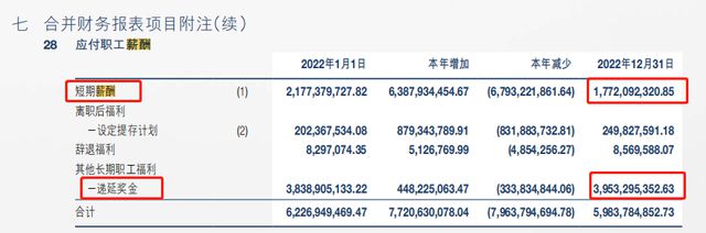 申万宏源2022年报显示,2022年末的应付员工薪酬合计59.84亿元,其中短期薪酬17.72亿元,递延奖金39.53亿元,递延奖金远超短期薪酬,是薪酬中的主项。