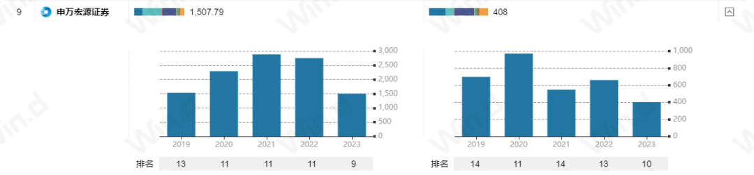 截至目前,2023年申万宏源承销债券数量408只,承销债券金额为1507.79亿元,排名第9。
