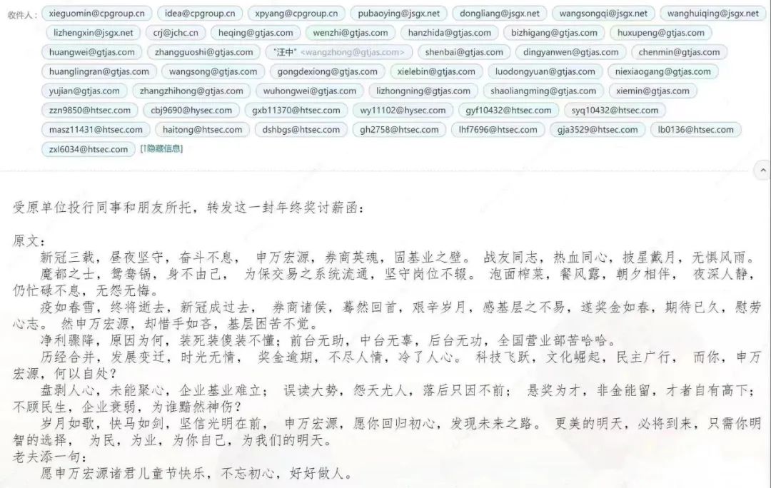 这一封年终奖讨薪函源自申万宏源前员工,称受前投行同事和朋友所托转发。从收件人来看,发布者同步转发给了其他同行,包括国泰君安(601211.SH)、华泰证券(601688.SH)等在内的头部券商人士。