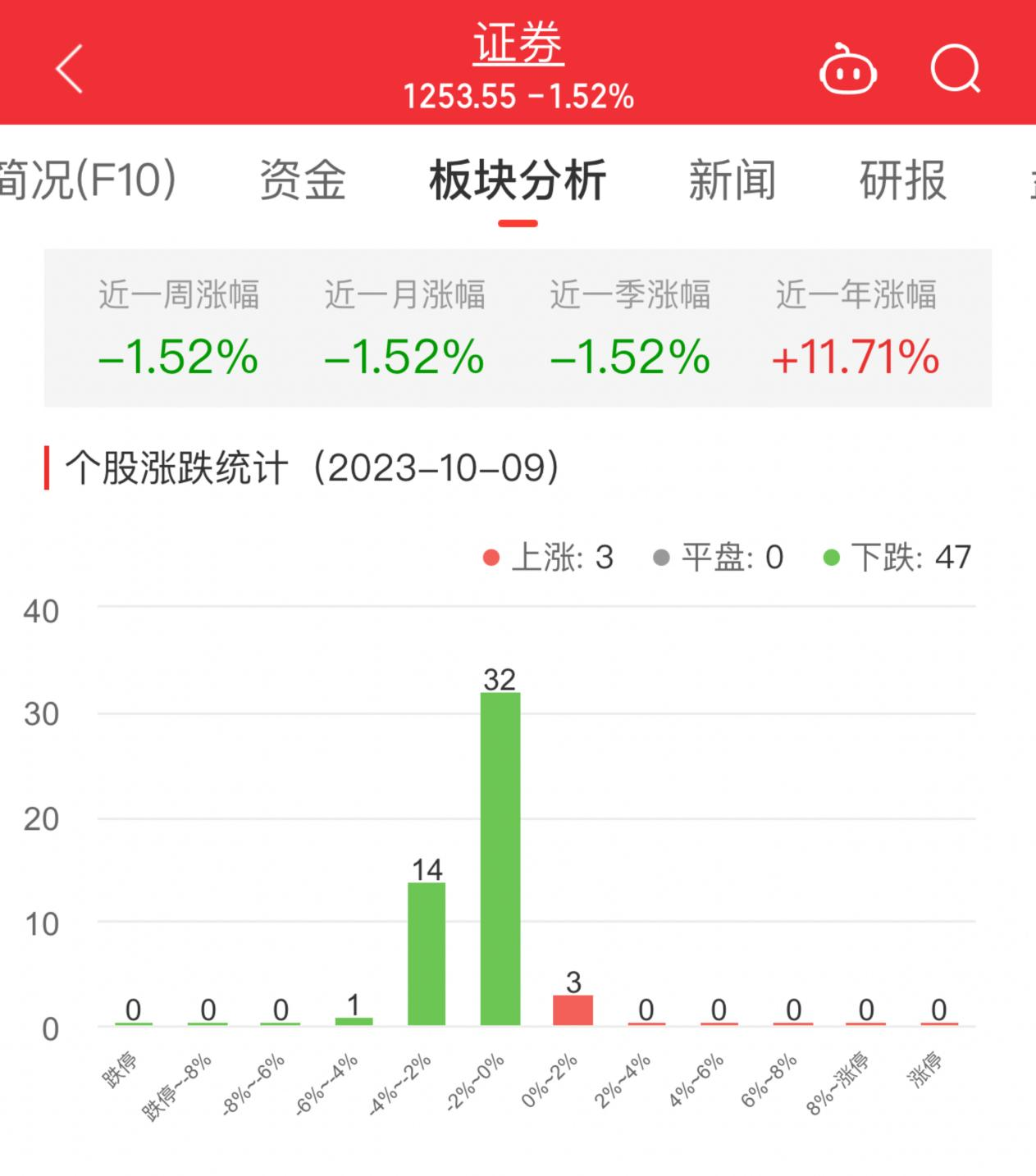 今日,证券板块整体跌幅1.52%,其中3只股票上涨,47只股票下跌。