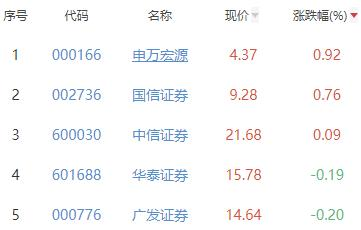 其中,申万宏源、国信证券、中信证券、华泰证券、广发证券位列板块涨幅前五位,涨幅分别为0.92%、0.76%、0.09%、-0.19%、-0.20%。