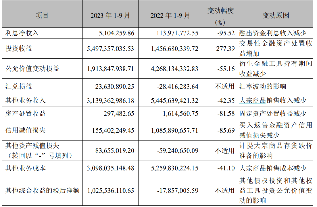 具体数据显示,2023年1-9月,投资收益54.97亿元,同比增长277.39%,主要原因是交易性金融资产处置收益增加;公允价值变动净收益还有19亿元左右,但同比减少55%以上,主要原因是衍生金融工具持有期间收益减少。