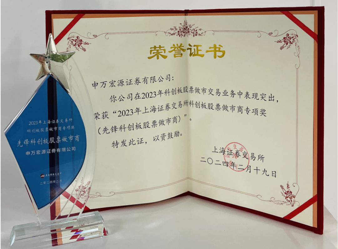日前,申万宏源收到上海证券交易所科创板股票做市商专项奖荣誉证书,被评为2023年度“先锋科创板股票做市商”,这是自公司2022年科创板做市业务开展以来,再次获评该荣誉,成为连续两年获得该奖项的科创板做市商。