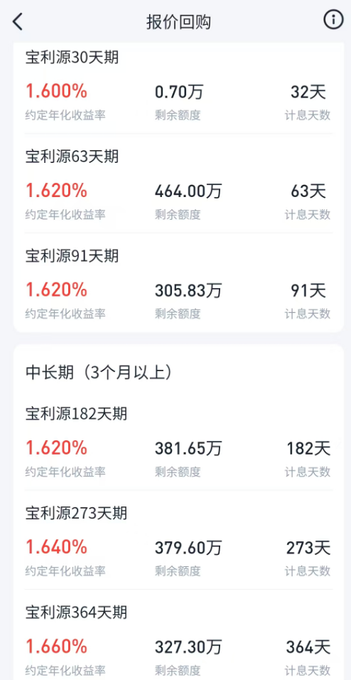 申万宏源各期限报价回购产品年化收益率(图片来源:申万宏源App)