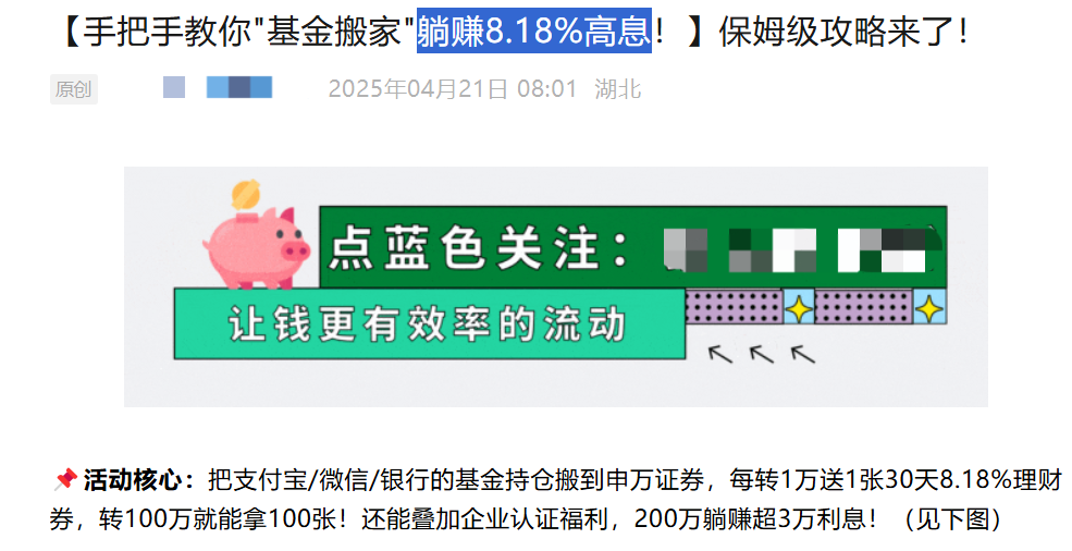 部分自媒体对申万宏源基金转托管理财券高收益的宣传(图片来源:微信截图)