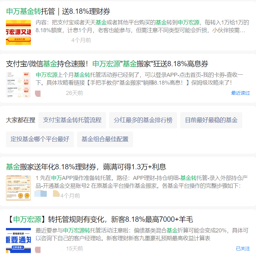 申万宏源当前就通过基金转托管理财券,把抢客户这件事拉出了新的高度!大致情况是,如果你在任何平台持有价值不低于5000元的场外股票型基金,将这些基金转托管到申万宏源,申万宏源就会给你同等资金额度、年化收益高达8.18%的理财券,而且这样的理财券可以连续购买2个月。