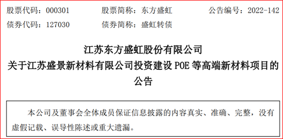 11月29日,东方盛虹(000301)发布公告,为加快新能源新材料布局,三级控股子公司江苏盛景新材料有限公司(以下简称盛景新材料)拟投资建设聚烯烃弹性体(POE)等高端新材料项目,该项目总投资97.30亿元,建设期为2年。