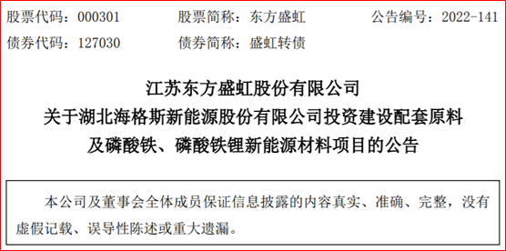 就在同一天,东方盛虹公告,二级控股子公司湖北海格斯新能源股份有限公司(以下简称湖北海格斯)拟投资建设配套原料及磷酸铁、磷酸铁锂新能源材料项目,该项目总投资186.84亿元。建设周期为2年。