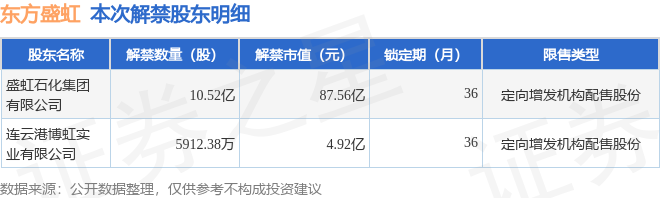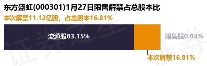 根据市场公开信息整理,东方盛虹(000301)于1月27日将有11.12亿股限售股份解禁,为公司定向增发机构配售股份,占公司总股本16.81%。(本次数据根据历史公告整理得出,实际情况以上市公司最新公告为准)本次解禁后,公司还有267.46万股限售股份,占总股本0.04%。具体如下图所示: