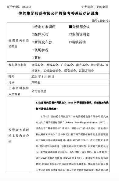 美的集团股份有限公司(以下简称“美的集团”或“公司”)1月18日晚间发布公告称,公司于当日与多家机构投资者召开了分析师会议。在会议上,美的集团透露,1月4日,美的楼宇科技旗下广东美的暖通设备有限公司正式宣布加入“科学碳目标倡议”(Science BasedTargetsinitiative,SBTi),并提交了“科学碳目标”承诺书。根据SBTi的相关规定,美的楼宇科技将在未来的24个月中制定出基于科学碳目标标准的全价值链温室气体减排目标及实施计划,并向SBTi提交验证。在正式提交承诺后,美的楼宇科技将进一步推进可持续发展转型。